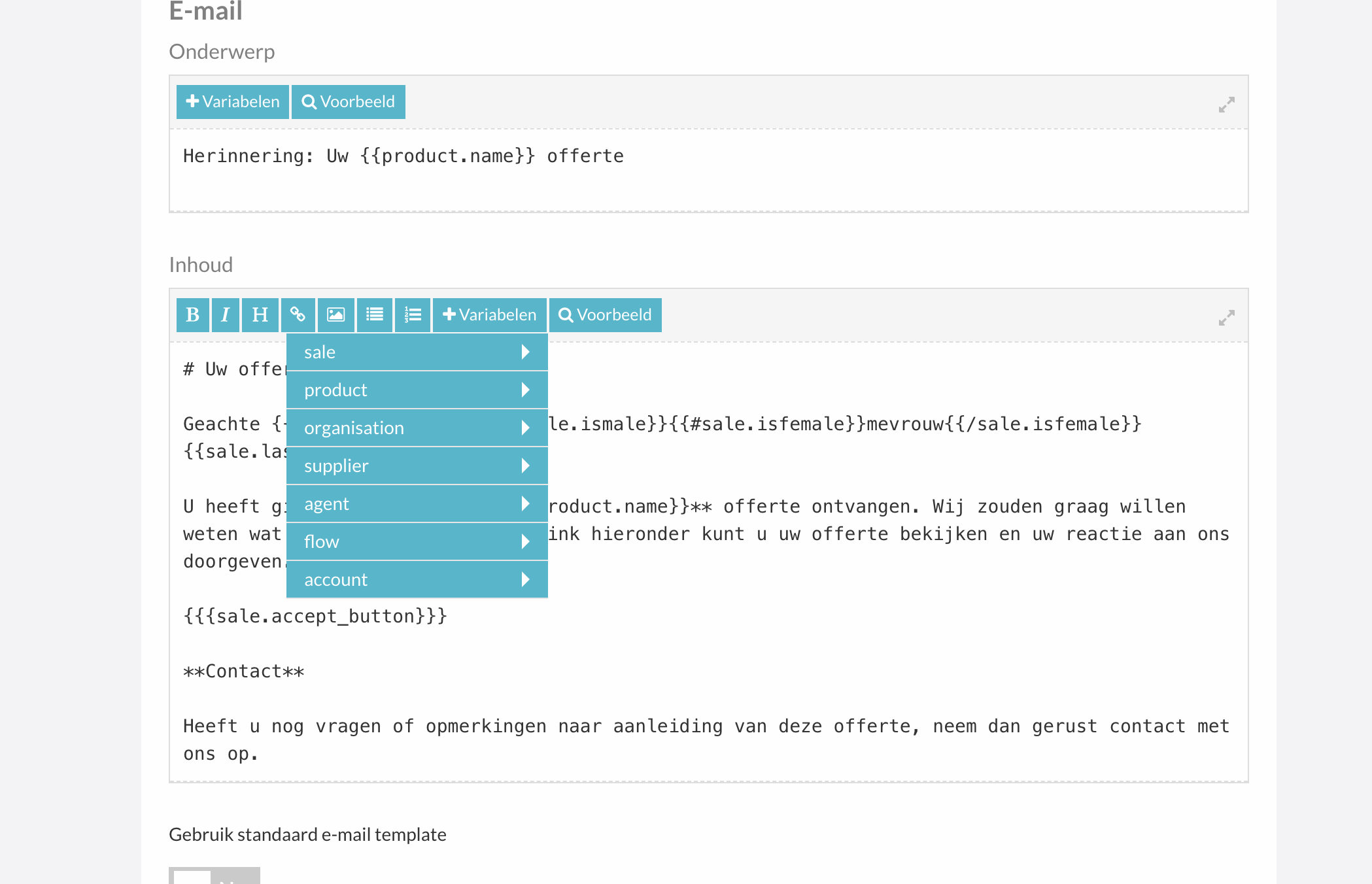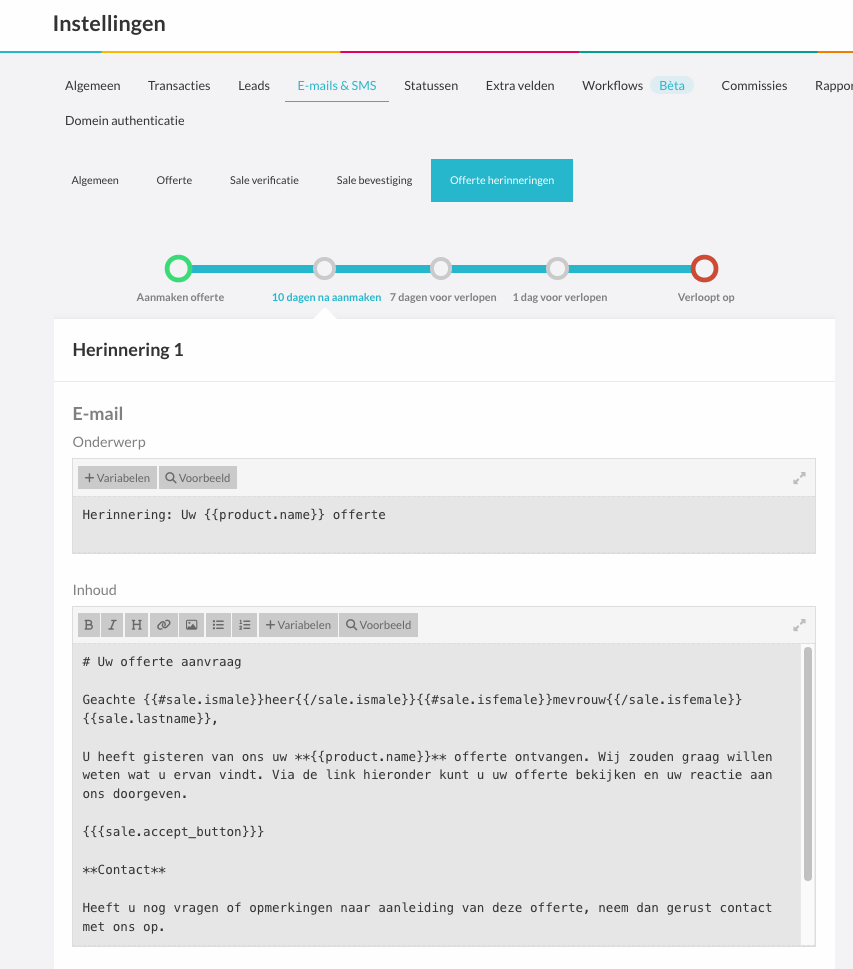 Personalisatie: Via de knop 'Variabelen' kun je dynamische velden toevoegen. Denk aan de naam van de klant, het gekozen product of de naam van de verkoper. Zo krijgt je klant een persoonlijke mail die precies aansluit op de aanvraag.