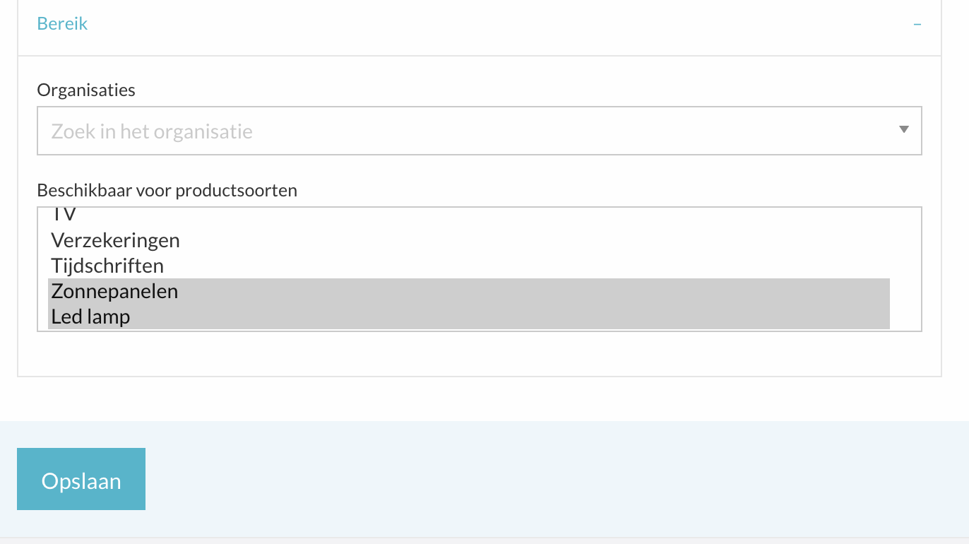 Geef bij 'Bereik' aan voor welke organisaties de flow zichtbaar moet zijn. Selecteer daarnaast welke productsoorten je in deze flow wilt tonen.