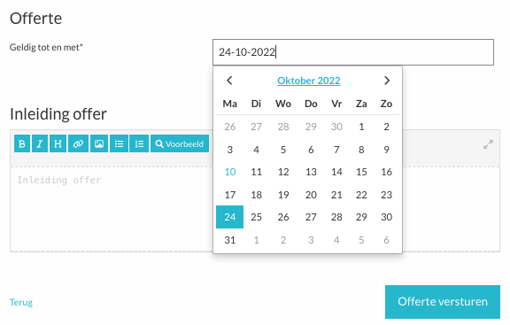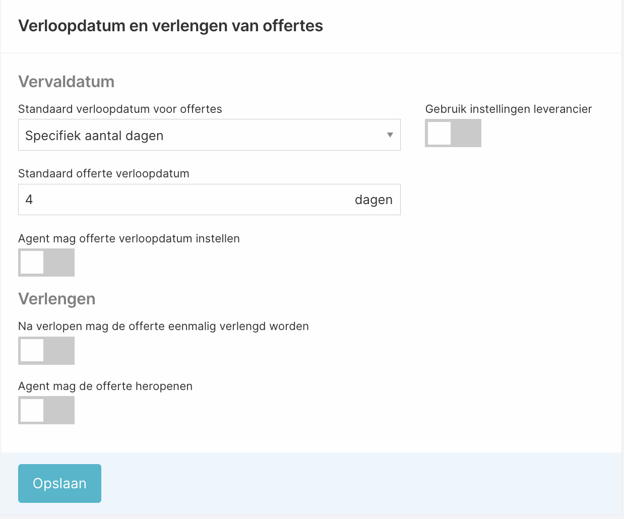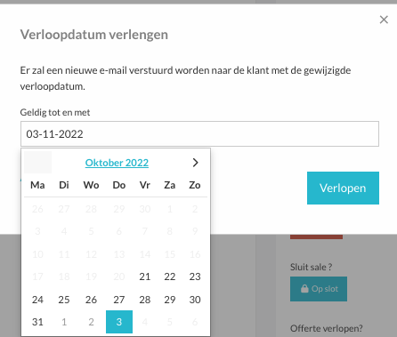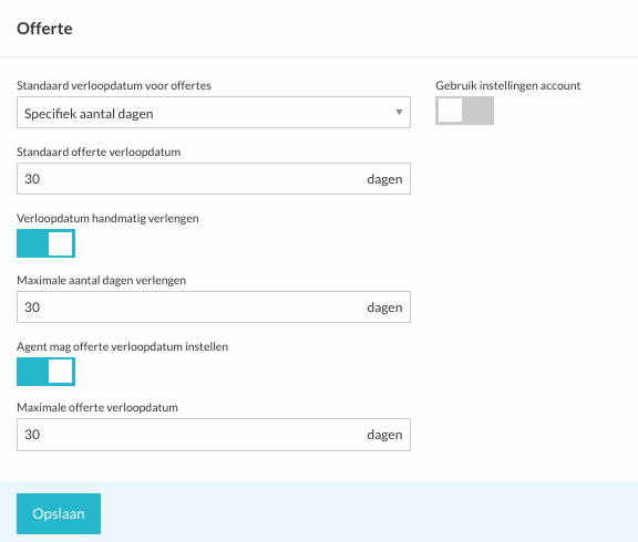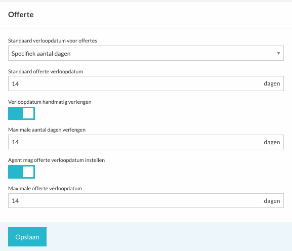 Agent mag offerte verloopdatum instellen: Hiermee geef je je verkopers de vrijheid om vlak voor het versturen zelf de geldigheid te bepalen, op basis van de instellingen die jij in de admin portal hebt klaargezet.