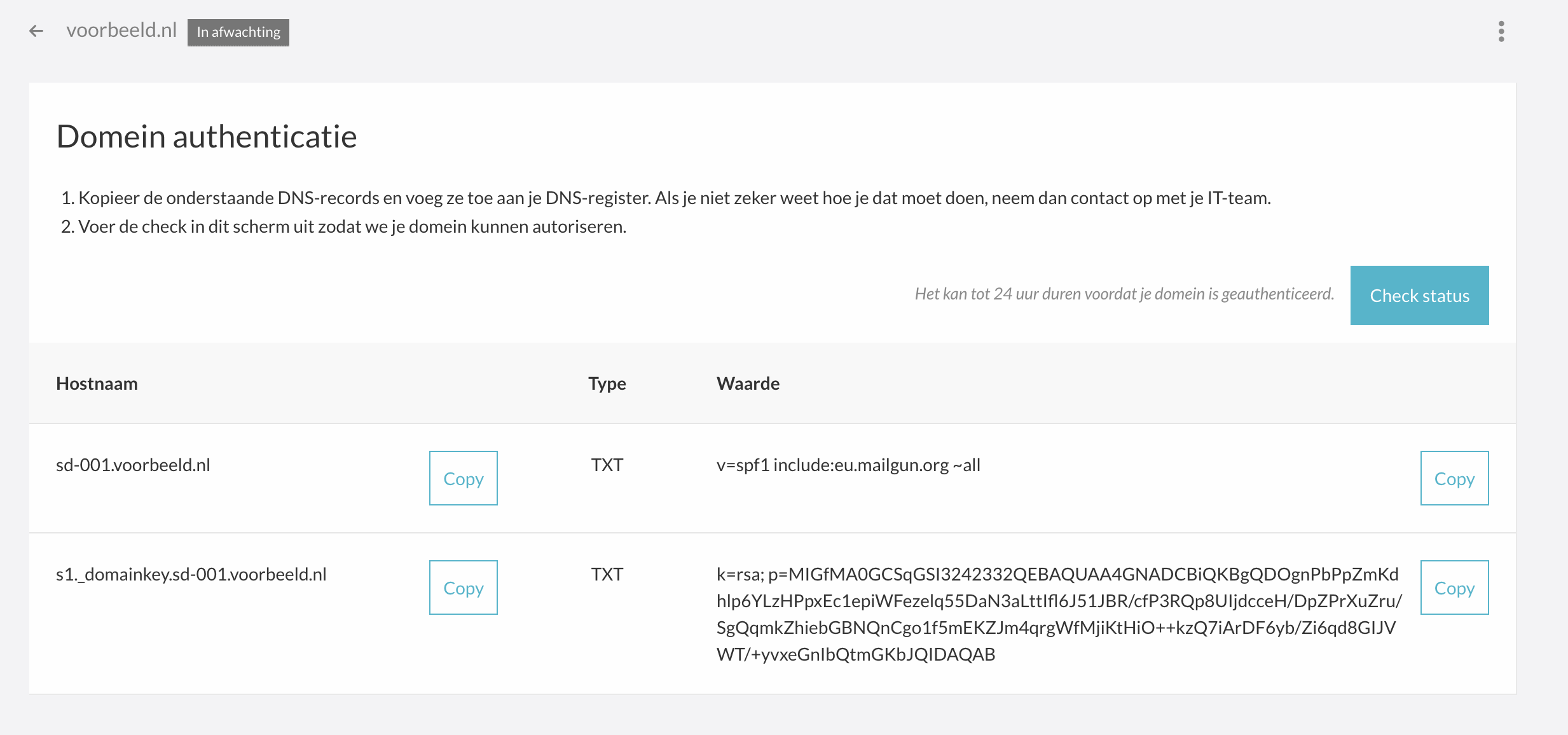 Realtime check: Wil je niet wachten? Klik dan binnen het domein op 'Check status' om de actuele status direct op te halen.