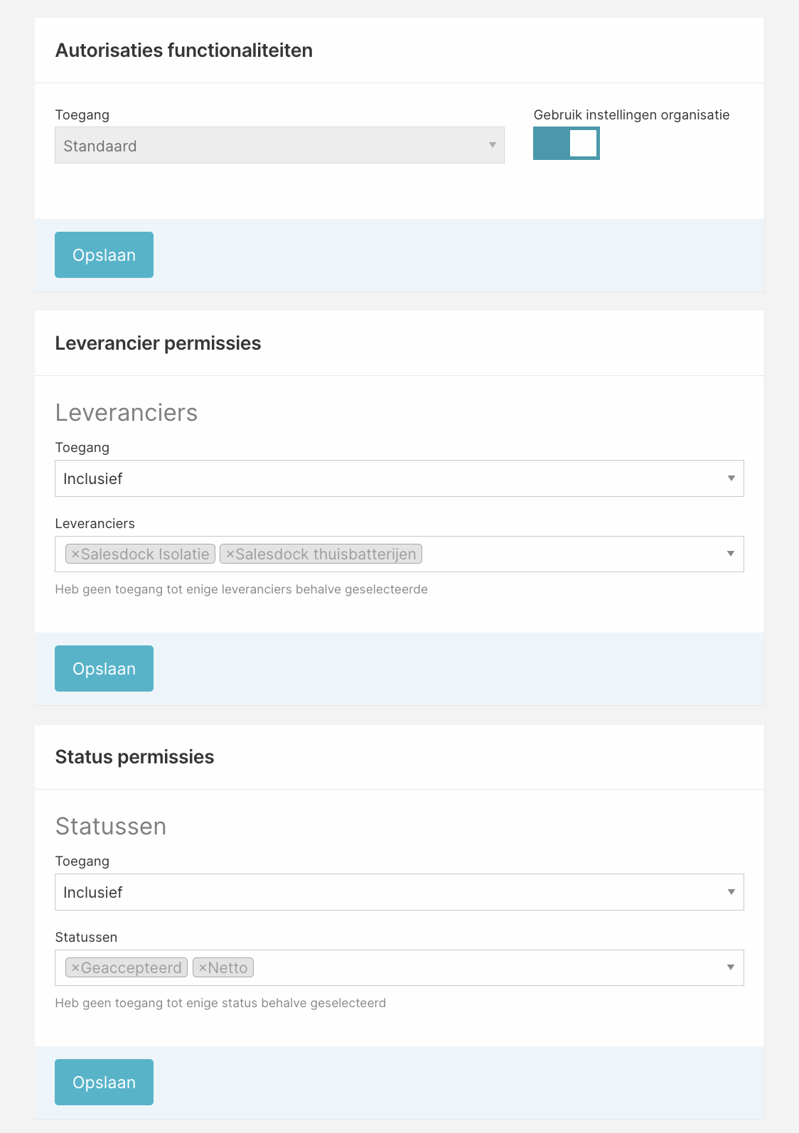 Tip: de veiligste setup voor een externe partner is: Resources op Standaard, Suppliers op Inclusief met alleen zijn eigen merken geselecteerd, Statussen op Inclusief met de statussen die hij mag verwerken.