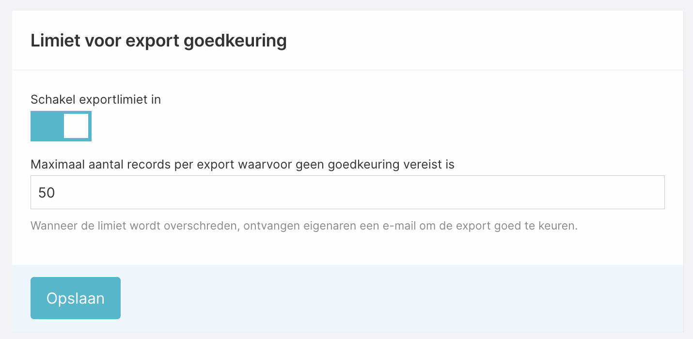 Via Instellingen>>Beveiliging>>Limiet voor export goedkeuring kun je het maximaal aantal records per export instellen waarvoor GEEN goedkeuring is vereist. Komt een gebruiker boven het ingestelde aantal, dan zal er een mail gestuurd worden naar gebruikers met de rol Eigenaar en Beheerders met volledige rechten en alleen zij kunnen de export goedkeuren.