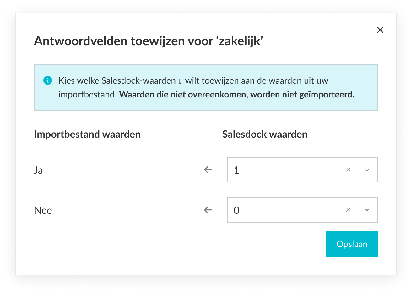 Waarden koppelen: We kunnen ontdekken dat sommige velden in je importbestand andere waarden hebben dan degene die we in Salesdock kunnen interpreteren. Als dit gebeurt, tonen we een waarschuwing naast het betreffende veld en kun je aangeven hoe je opgegeven waarden overeenkomen met die in ons systeem. Let op: In geval van een waarde-mismatch voor een veld, zullen de waarden uit je importbestand die niet zijn gekoppeld aan bestaande Salesdock-waarden, niet worden geïmporteerd (deze blijven leeg in Salesdock).