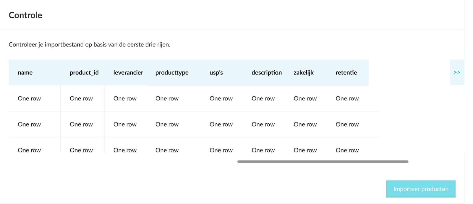 In de laatste stap vóór het importeren zie je de eerste drie rijen van je import als een voorbeeld. Op deze manier kun je controleren of je de kolommen hebt toegewezen zoals je wilt. Als je problemen vindt in de configuratie, kun je naar de vorige stap gaan en wijzigingen aanbrengen in de veldconfiguratie. Wanneer alles correct lijkt, klik je op de import-knop en beginnen we met het maken of bijwerken van je producten in Salesdock!