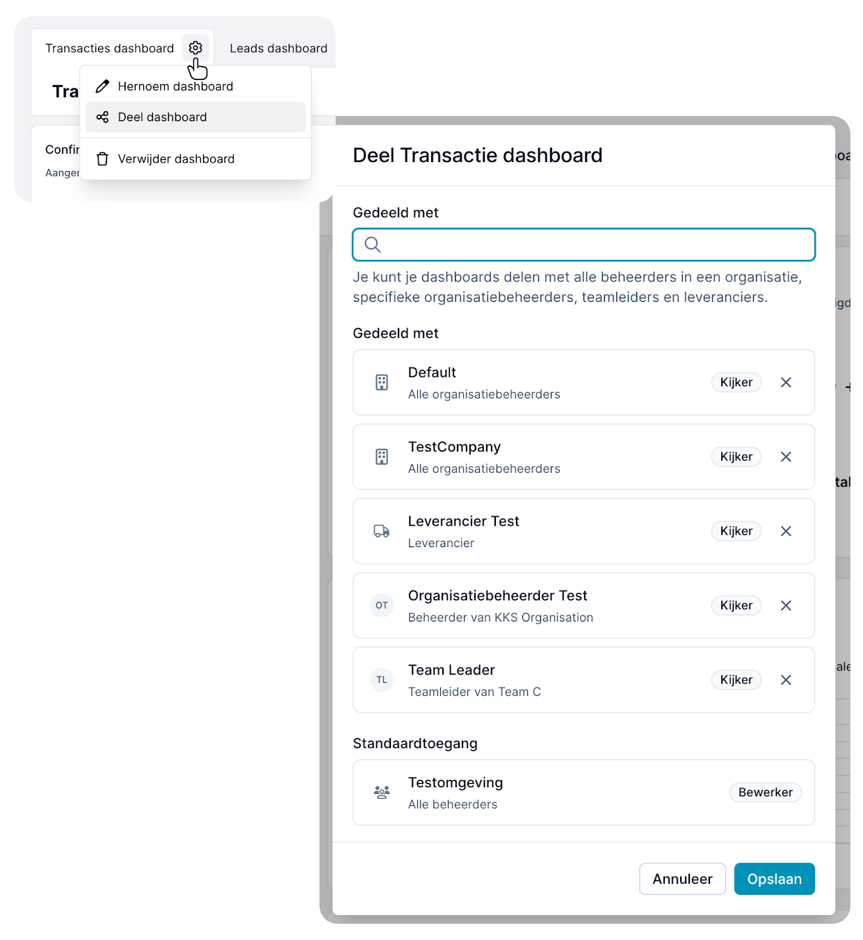 De deelfunctionaliteit is beschikbaar via het tandwiel-icoon op de actieve dashboard-tab (bovenaan het scherm). Dit opent een dropdown met opties om je dashboard te hernoemen, te delen of te verwijderen. Wanneer je op ‘deel dashboard’ klikt, opent er een pop-up waarin je organisatiebeheerders (individuele gebruikers), organisaties (alle gebruikers met de rol beheerder), teamleiders en leveranciers bekijk rechten